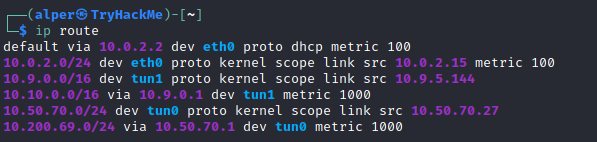 The target system may be a pivoting point to another network. The ifconfig command will give us information about the network interfaces of the system. The example below shows the target system has three interfaces (eth0, tun0, and tun1). Our attacking machine can reach the eth0 interface but can not directly access the two other networks.