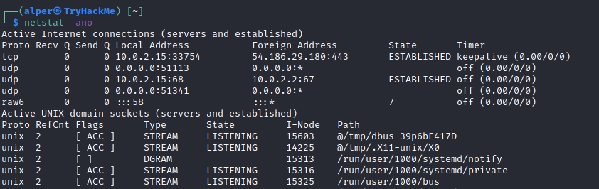 The netstat usage you will probably see most often in blog posts, write-ups, and courses is netstat -ano which could be broken down as follows;