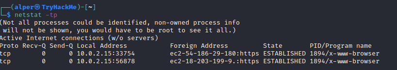 We can see the “PID/Program name” column is empty as this process is owned by another user.