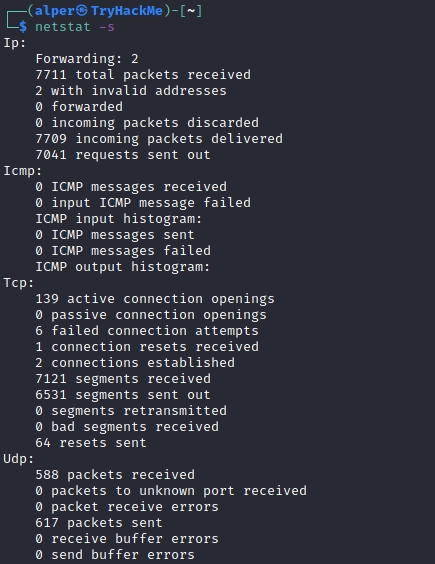 netstat -s: list network usage statistics by protocol (below) This can also be used with the-tor-uoptions to limit the output to a specific protocol.