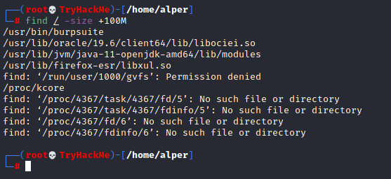 The example above returns files that are larger than 100 MB. It is important to note that the “find” command tends to generate errors which sometimes makes the output hard to read. This is why it would be wise to use the “find” command with “-type f 2>/dev/null” to redirect errors to “/dev/null” and have a cleaner output (below).