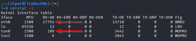 netstat -i: Shows interface statistics. We see below that “eth0” and “tun0” are more active than “tun1”.