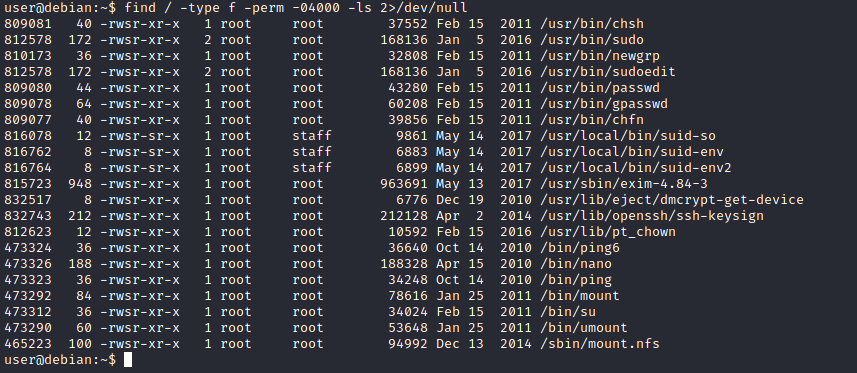 We see that the nano text editor has the SUID bit set by running the find / -type f -perm -04000 -ls 2>/dev/null command.