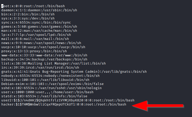 nano /etc/shadow will print the contents of the /etc/shadow file. We can now use the unshadow tool to create a file crackable by John the Ripper. To achieve this, unshadow needs both the /etc/shadow and /etc/passwd files.