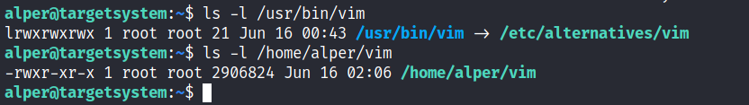 Please note that neither vim nor its copy has the SUID bit set. This privilege escalation vector is therefore not discoverable when enumerating files looking for SUID.