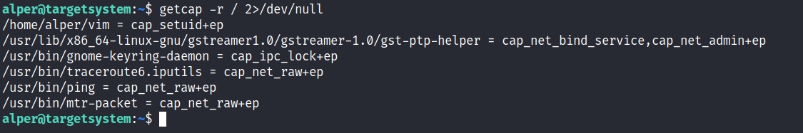 GTFObins has a good list of binaries that can be leveraged for privilege escalation if we find any set capabilities. We notice that vim can be used with the following command and payload: