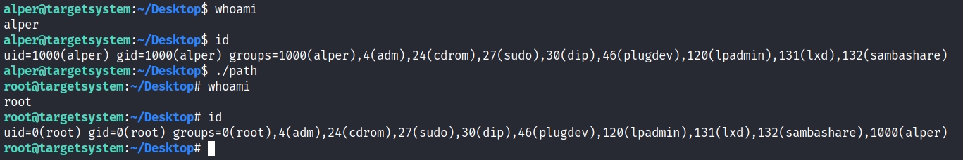 We have given executable rights to our copy of /bin/bash, please note that at this point it will run with our user’s right. What makes a privilege escalation possible within this context is that the path script runs with root privileges.
