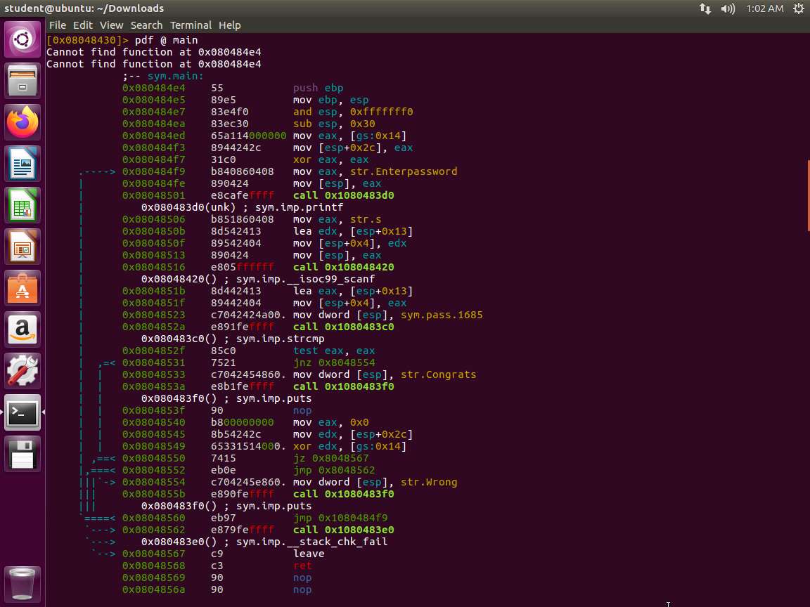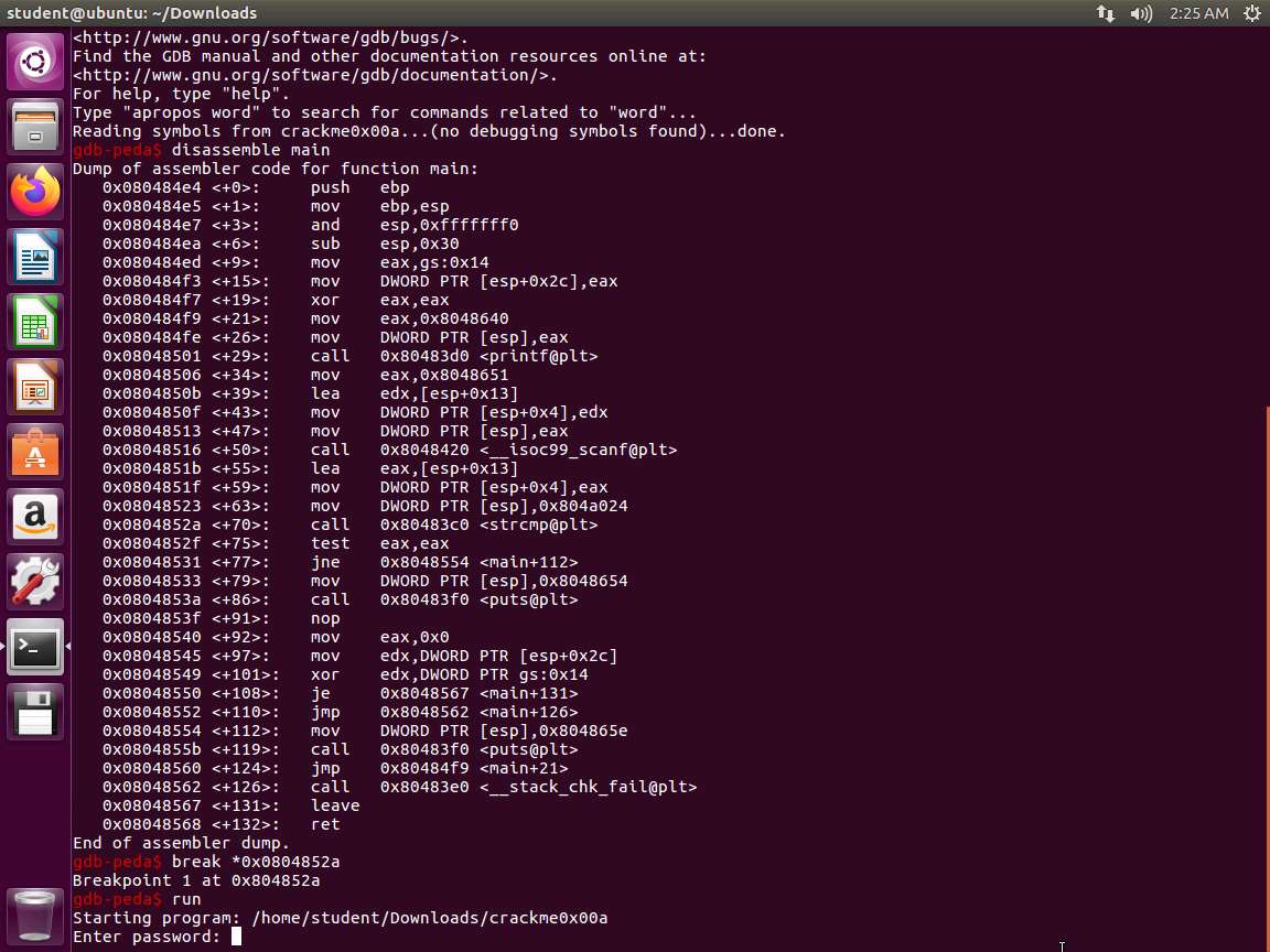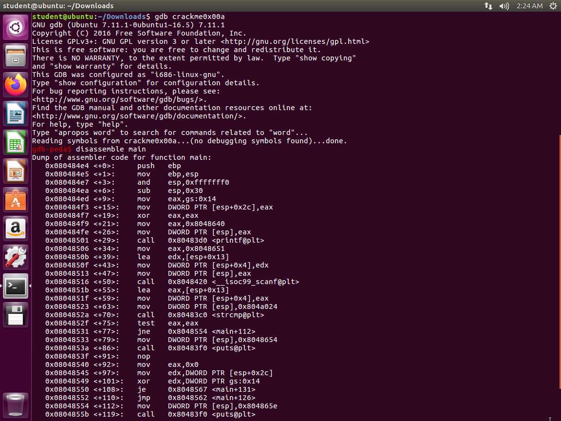 m6e1s14.jpg We want to look at the code with another tool, which we will now explore. In the terminal window, exit from Radare2 and enter gdb crackme0x00a. This will load the executable. Next, enter disassemble main. An example of the output of this command is shown in the following screenshot.