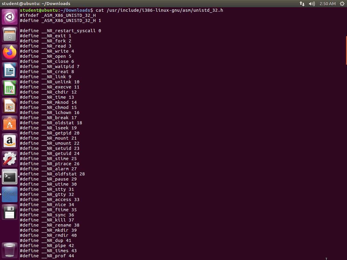 In the 32-bit machine, enter cat /usr/include/i386-linux-gnu/asm/unistd_32.h. An example of the output of this command is shown in the following screenshot.
