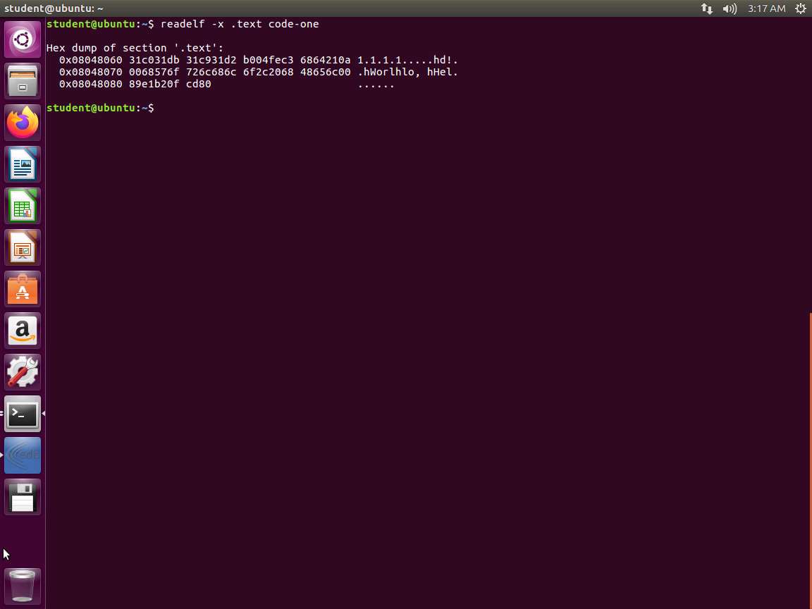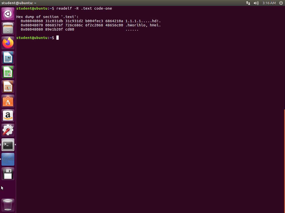 Next, enter readelf -x .text code-one. The output is the same as the previous command, but this option dumps the hexadecimal.