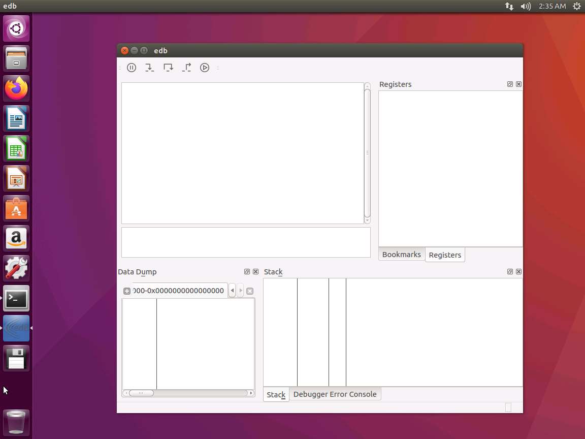 Screenshot This is the dashboard for Evan's Debugger. We have discussed edb very briefly. You are encouraged to read more here: https://github.com/eteran/edb-debugger/wiki.