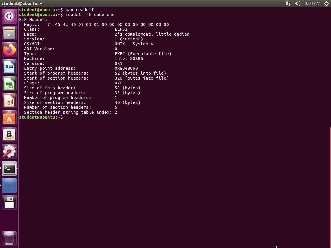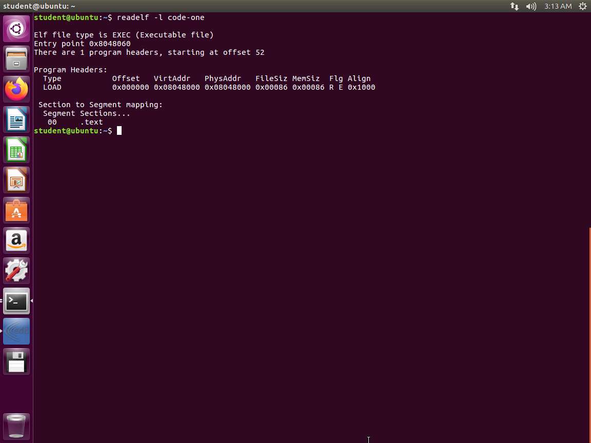 Next, we will look at the listing. Enter readelf -l code-one (that is a n "el"). An example of the output of this command is shown in the following screenshot.