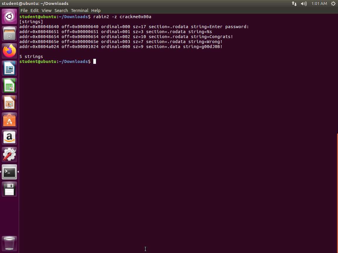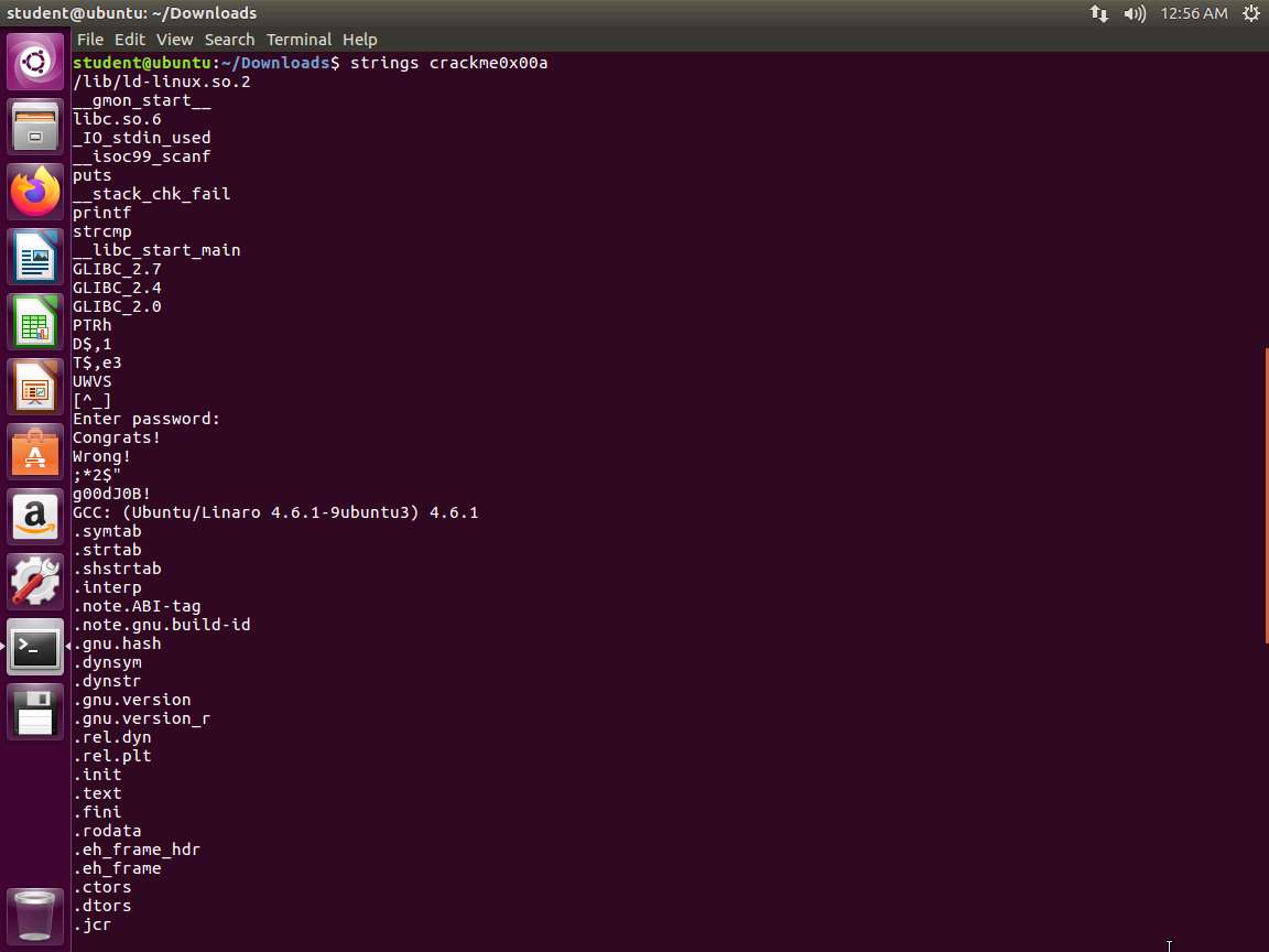 Screenshot Let us now use powerful tool strings to see what we can discover in the binary. Enter strings crackme0x00a. An example of the output of this command is shown in the following screenshot.