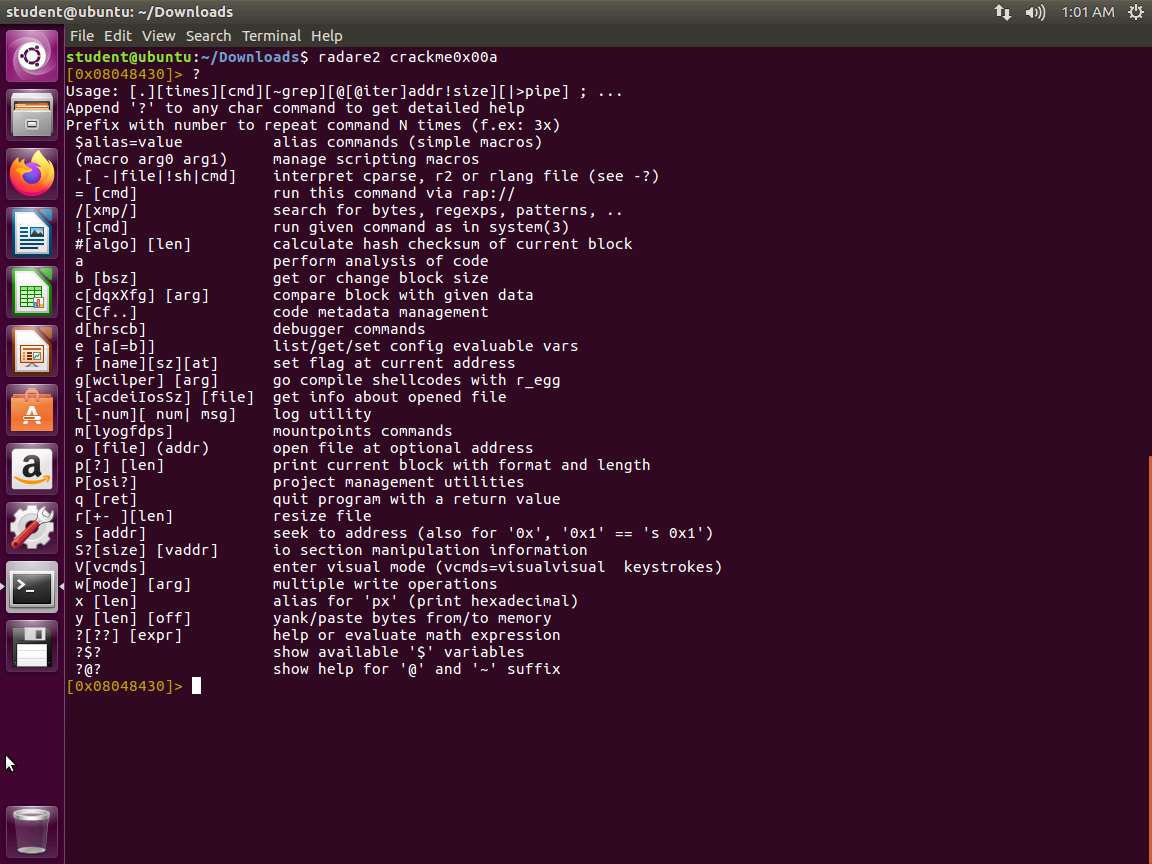 Screenshot Next, we will use the Radare2 tool to look at the executable. In the terminal window, enter radare2 crackme0x00a. Once the program is entered, enter ?. This will allow you to review the different options. An example of the output of this command is shown in the following screenshot.