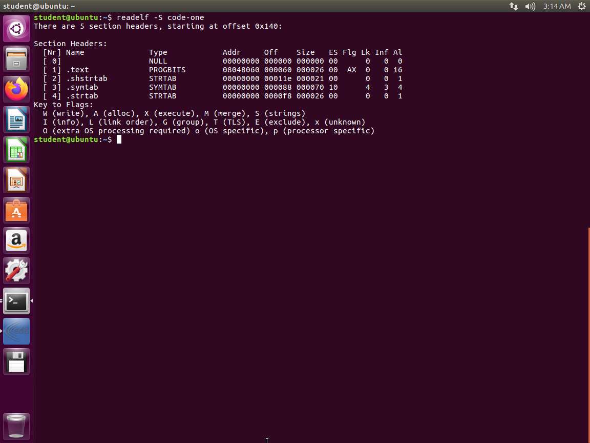 Next, enter readelf -S code-one. An example of the output of this command is shown in the following screenshot.