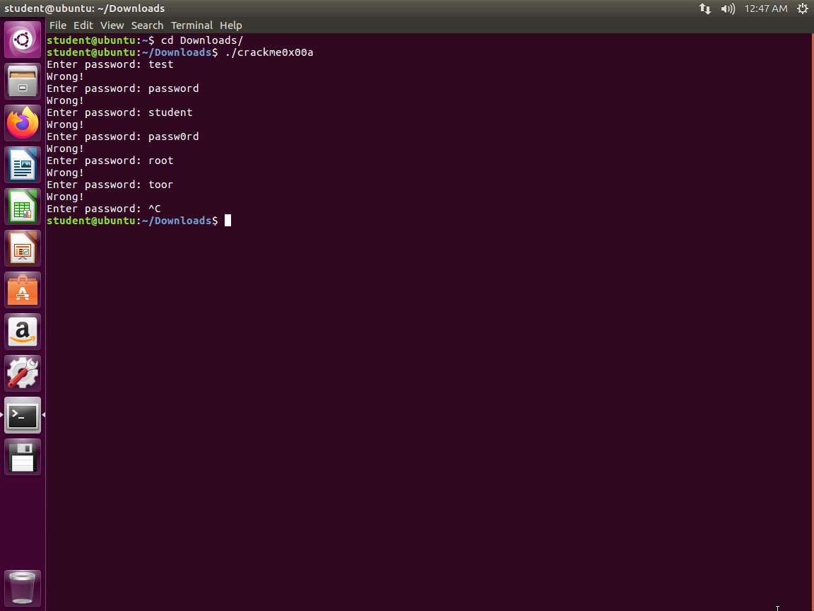 Screenshot Once you are in the folder, enter ./crackme0x00a. In the 64-bit machine, the program will not run since it is not built for 64 bit, so we will continue with the 32-bit machine for now. Once you run the program, enter some passwords to see if you can determine what the password is. An example of this is shown in the following screenshot.