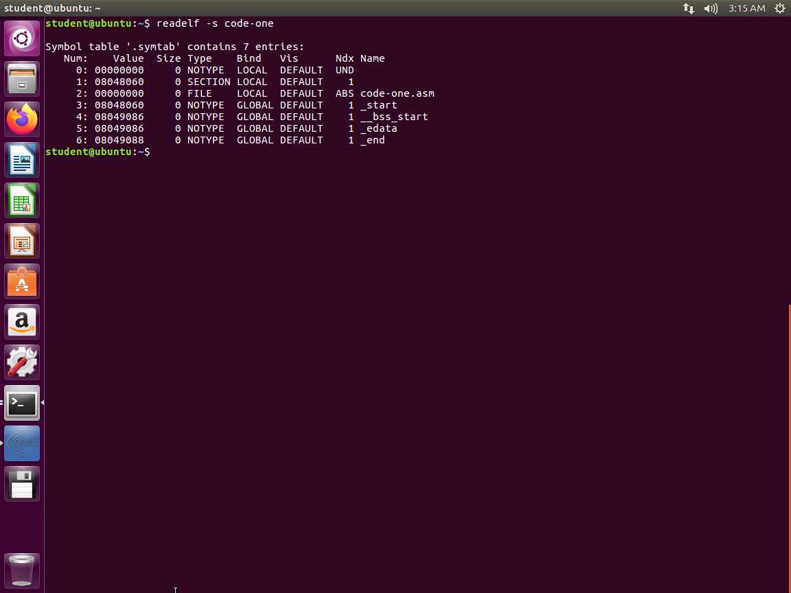 Next, enter readelf -s code-one. An example of the output of this command is shown in the following screenshot.