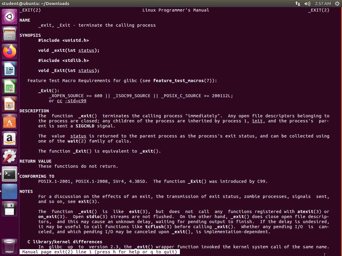 Screenshot Open another terminal window. Next, enter man 2 exit. Take a few minutes and review the information in the man page.