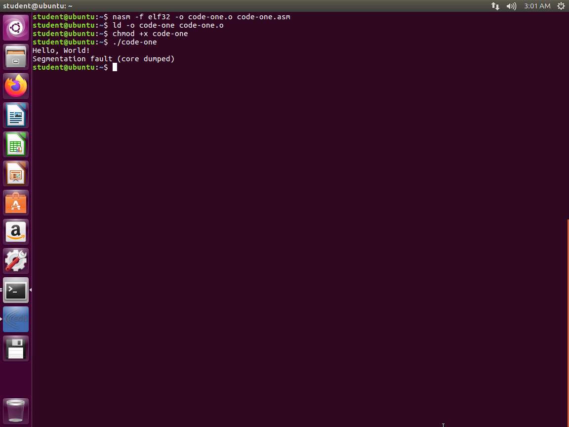 TypeCopyglobal _start section .text _start: ; write(int fd, const void *buf, size_t count) xor eax,eax xor ebx,ebx xor ecx,ecx xor edx,edx mov al,0x4 inc bl push 0x000a2164 push 0x6c726f57 push 0x202c6f6c push 0x6c6548 mov ecx,esp mov dl,0xf int 0x80Save the files as code-one.asm, and ensure that the indentations are the same as in the example.
