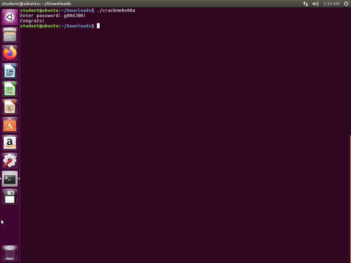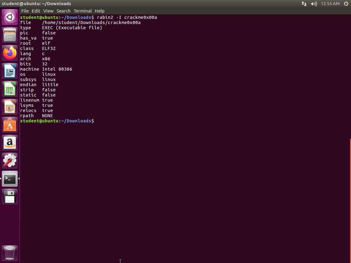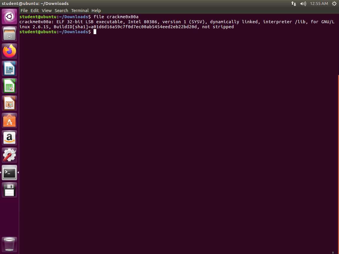 Screenshot Since we could not guess it, we now need to perform an analysis and see what we can learn about the file. We will use the file command. Enter file crackme0x00a. The output of this command is shown in the following screenshot.