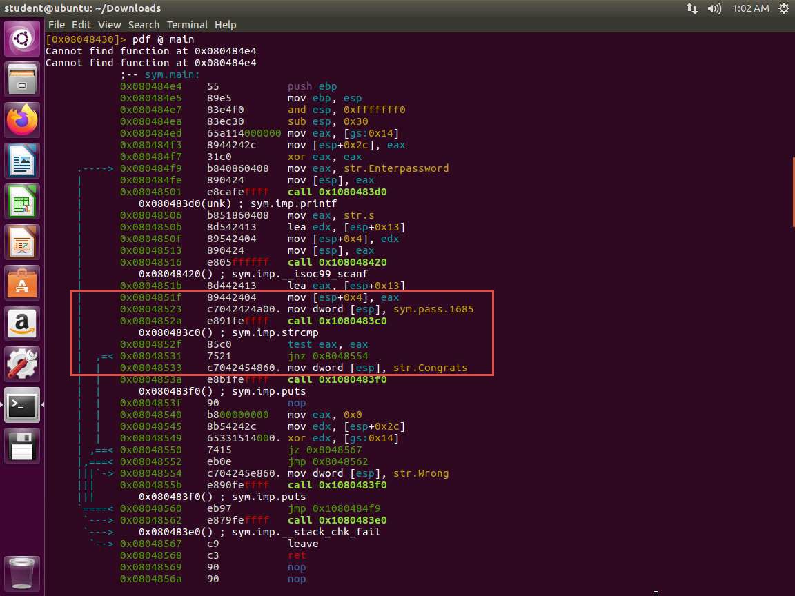 Screenshot Take a few minutes and look through the disassembled code. An example of this is strcmp, which is where our password is evaluated. Please check the following screenshot.