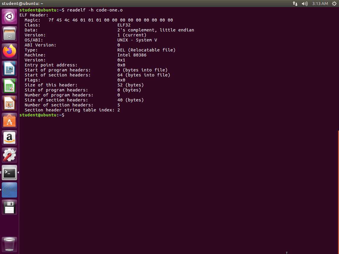 Next, we want to examine the object file. Enter readelf -h code-one.o. An example of the output of this command is shown in the following screenshot.