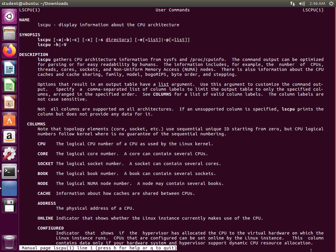 Let us now explore the different methods to extract information about the machine we are running. In the terminal window of the 32-bit virtual machine, enter man lscpu. Take a few minutes and review the information there.