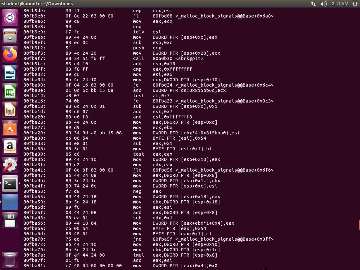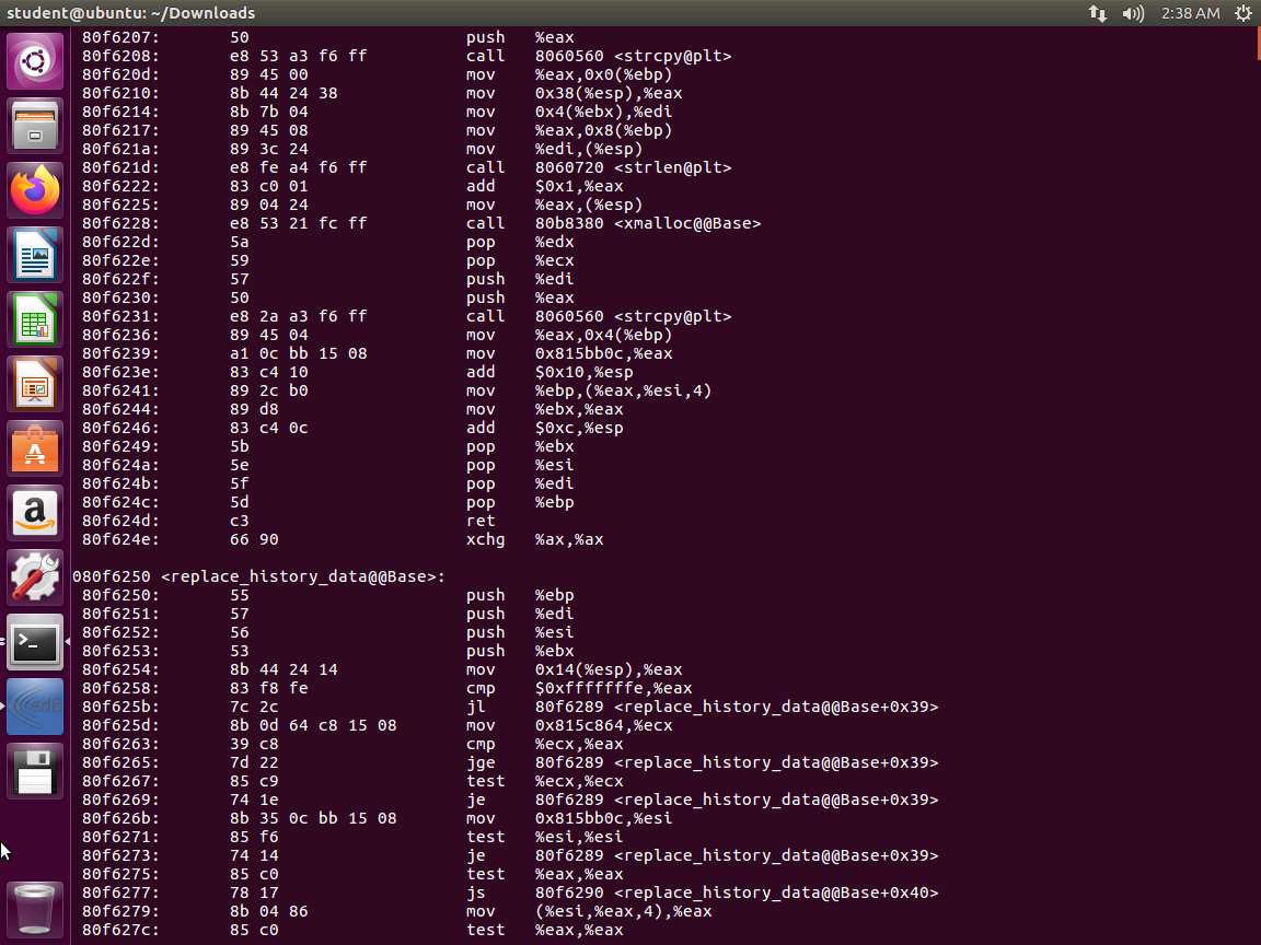 Let us now explore the 32-bit code and its components. In the 32-bit VM, enter objdump -d /bin/bash. An example of the output of this command is shown in the following screenshot.