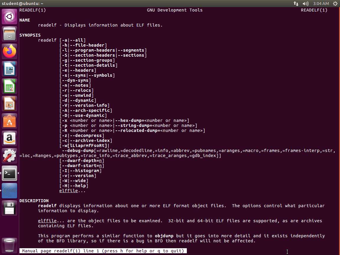 Screenshot Now we are ready to learn more about ELF files. Enter man readelf. An example of the output of this command is shown in the following screenshot.