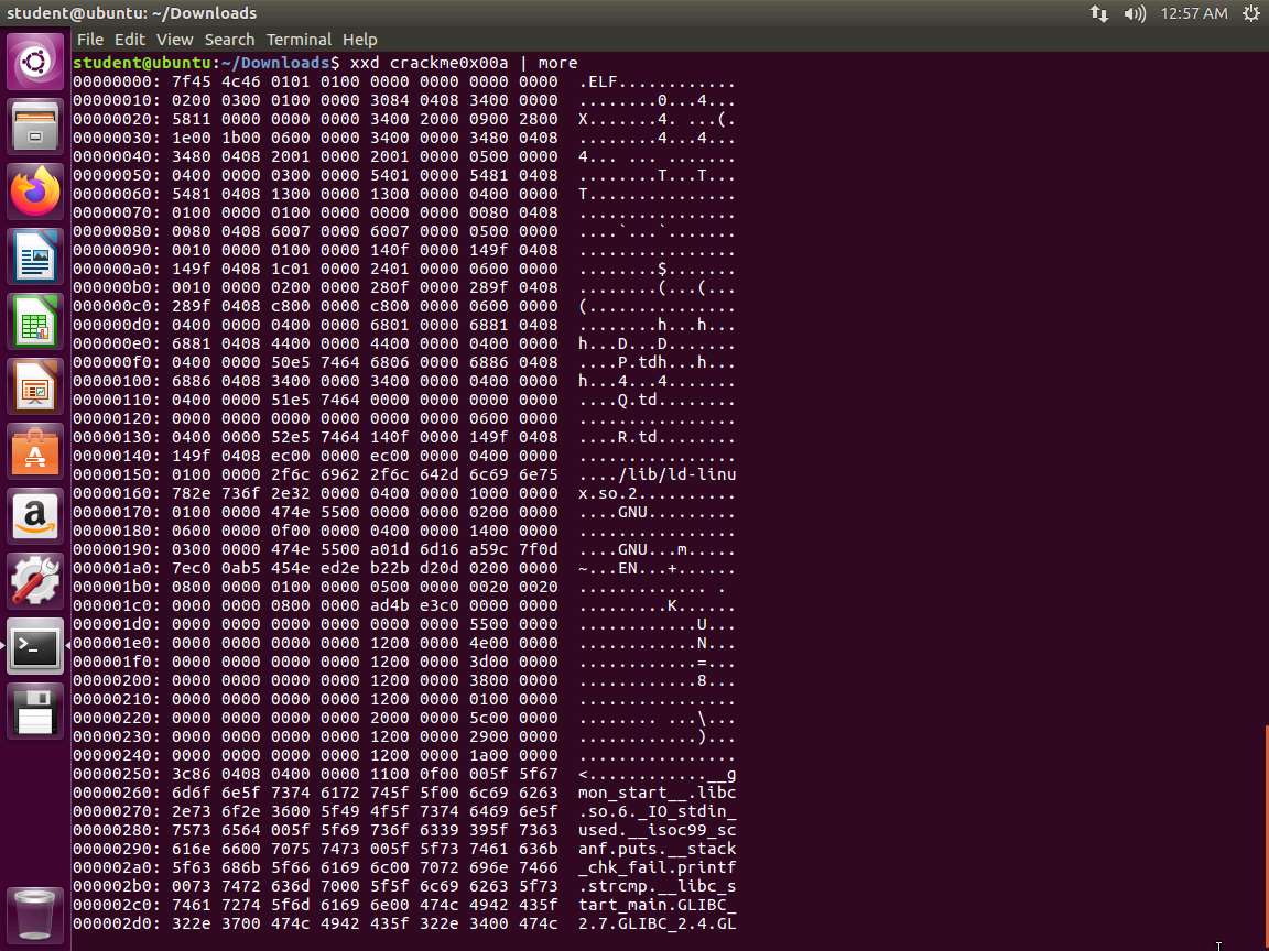 In the terminal window, enter xxd crackme0x00a | more. The output of this command is shown in the following screenshot.
