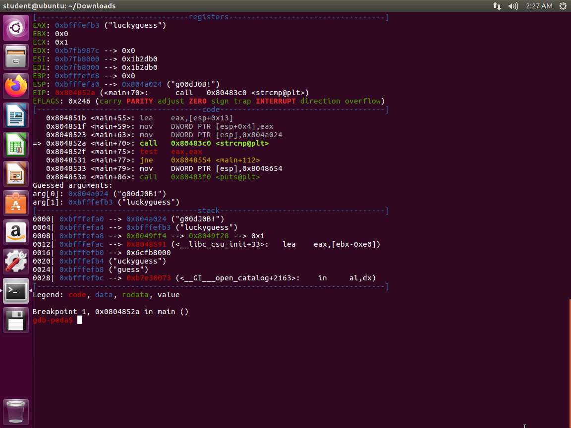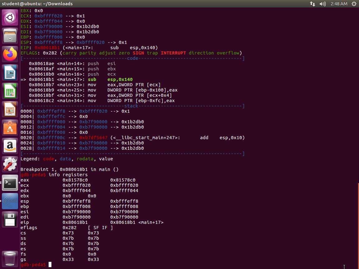 Screenshot Now, let us use gdb to look at the registers. In the terminal window, enter the following commands: