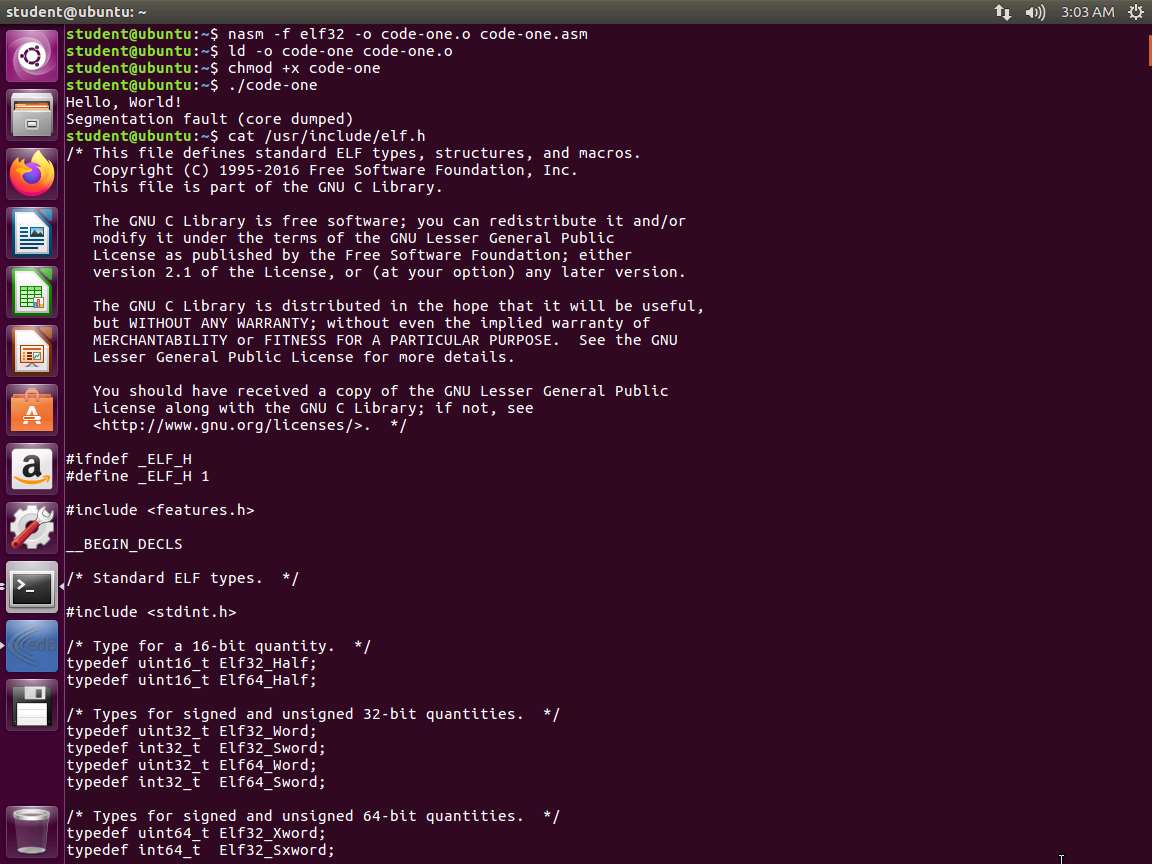 Take a few minutes and read the information contained within the man page. Once you have exited the man page, enter cat /usr/include/elf.h. The output of this command is shown in the following screenshot.