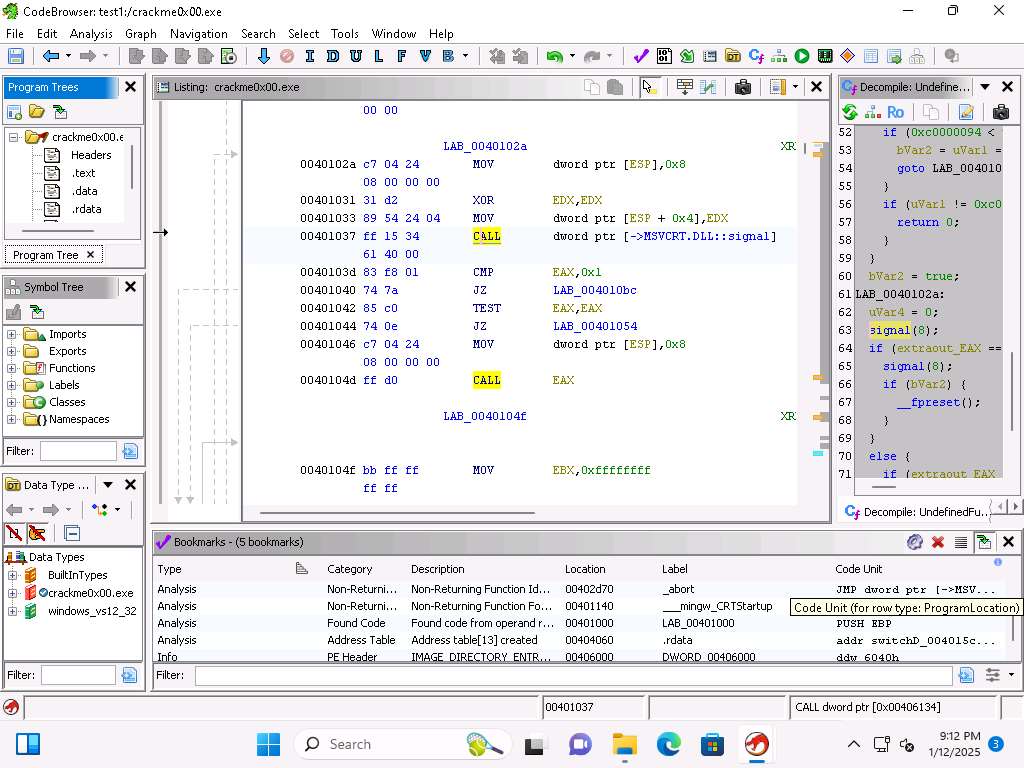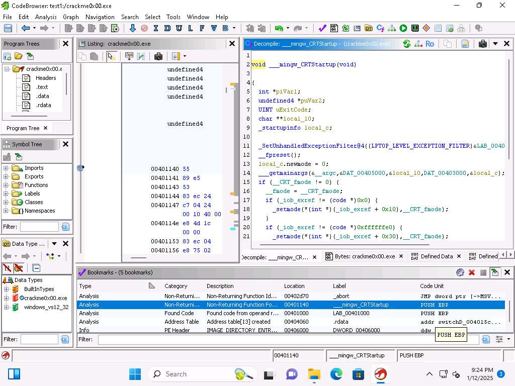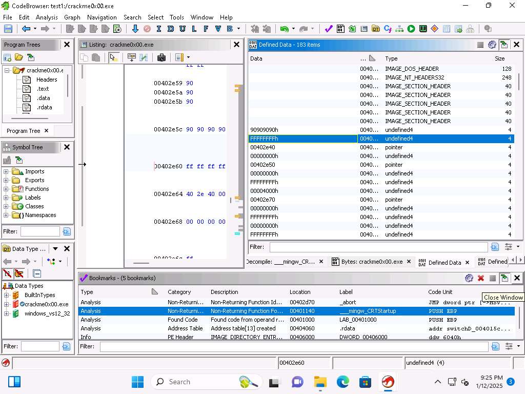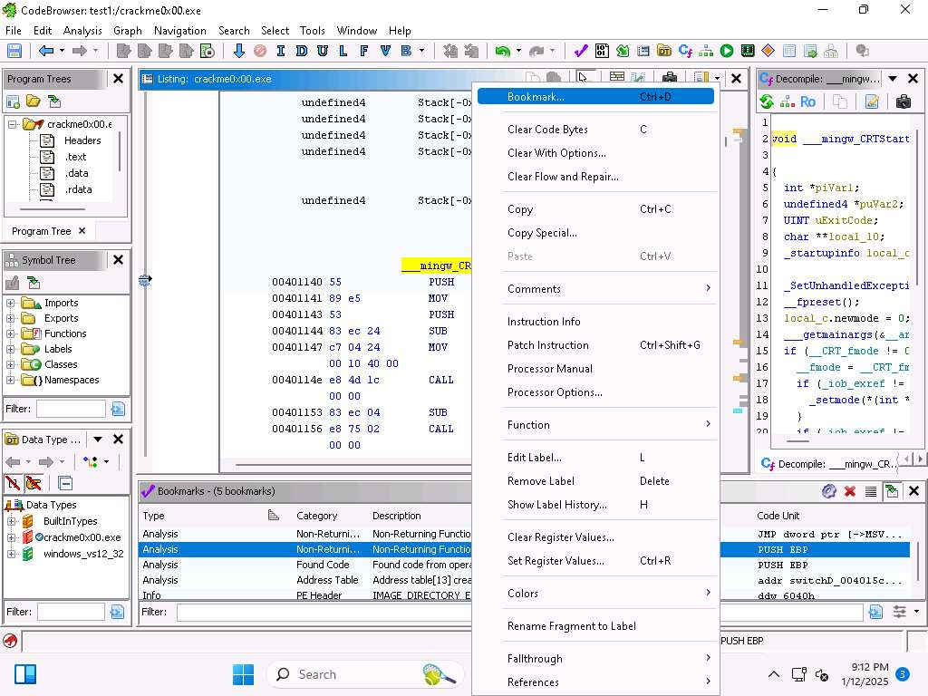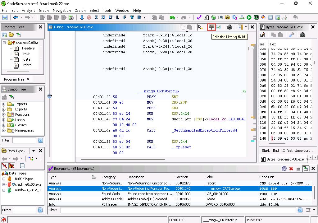 The first tool we will explore is the Bookmark tool. You can close the decompile window since we do not need it at this time. We use Bookmarks to flag addresses in the code that we are investigating.