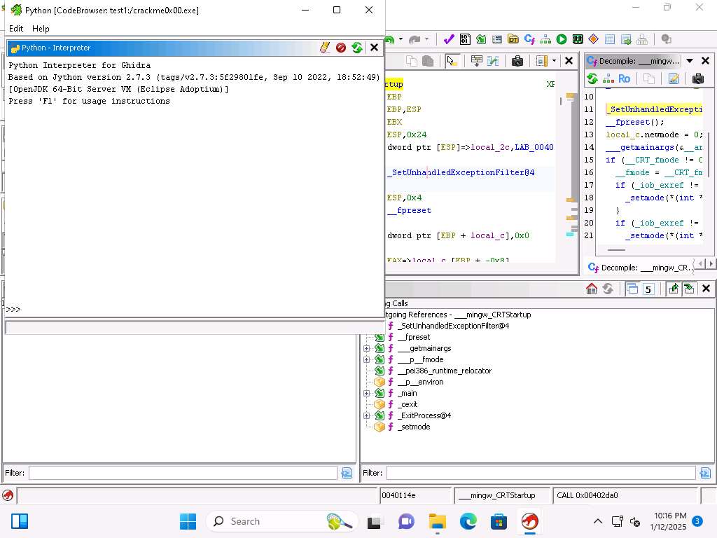 Screenshot This has been an introduction to Ghidra, and we will end the lab here. You are encouraged to explore this code more if you want a refresher on it.