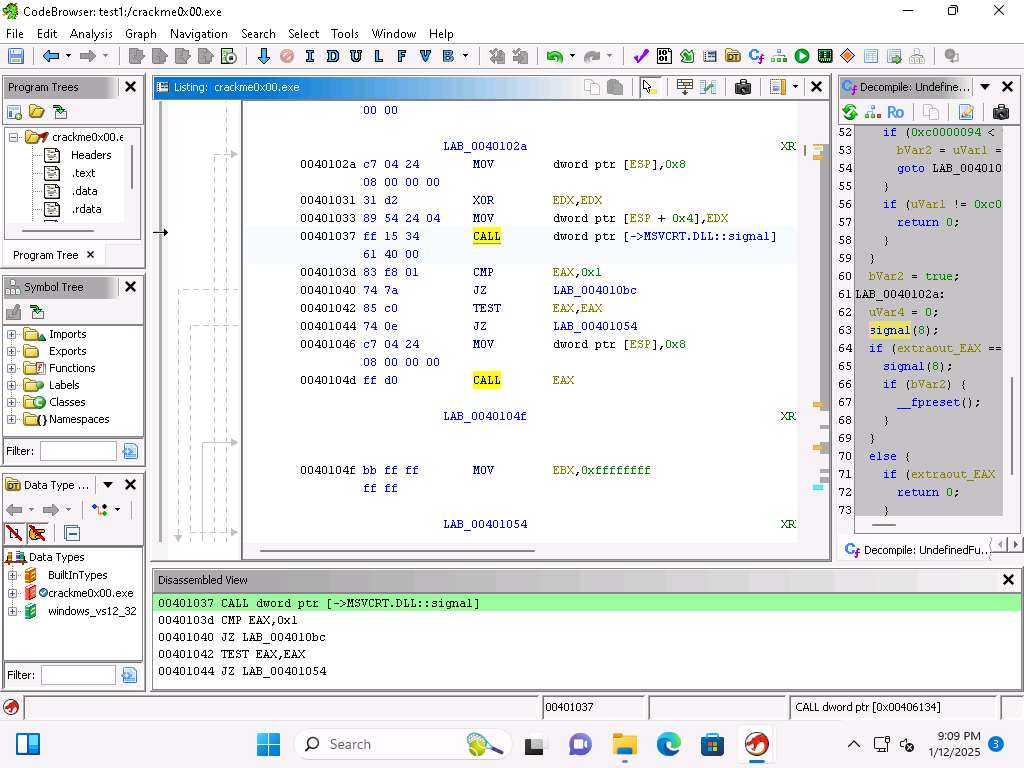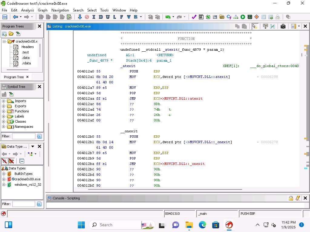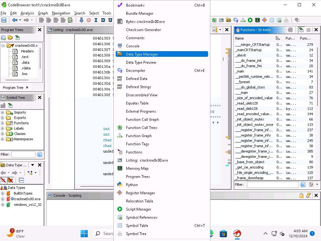 Screenshot The Listing window, shows the decompiled code of the executable.