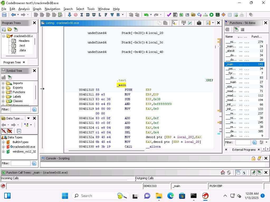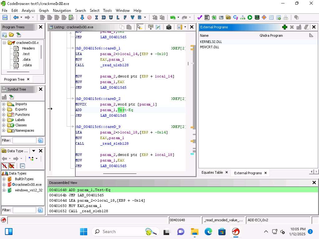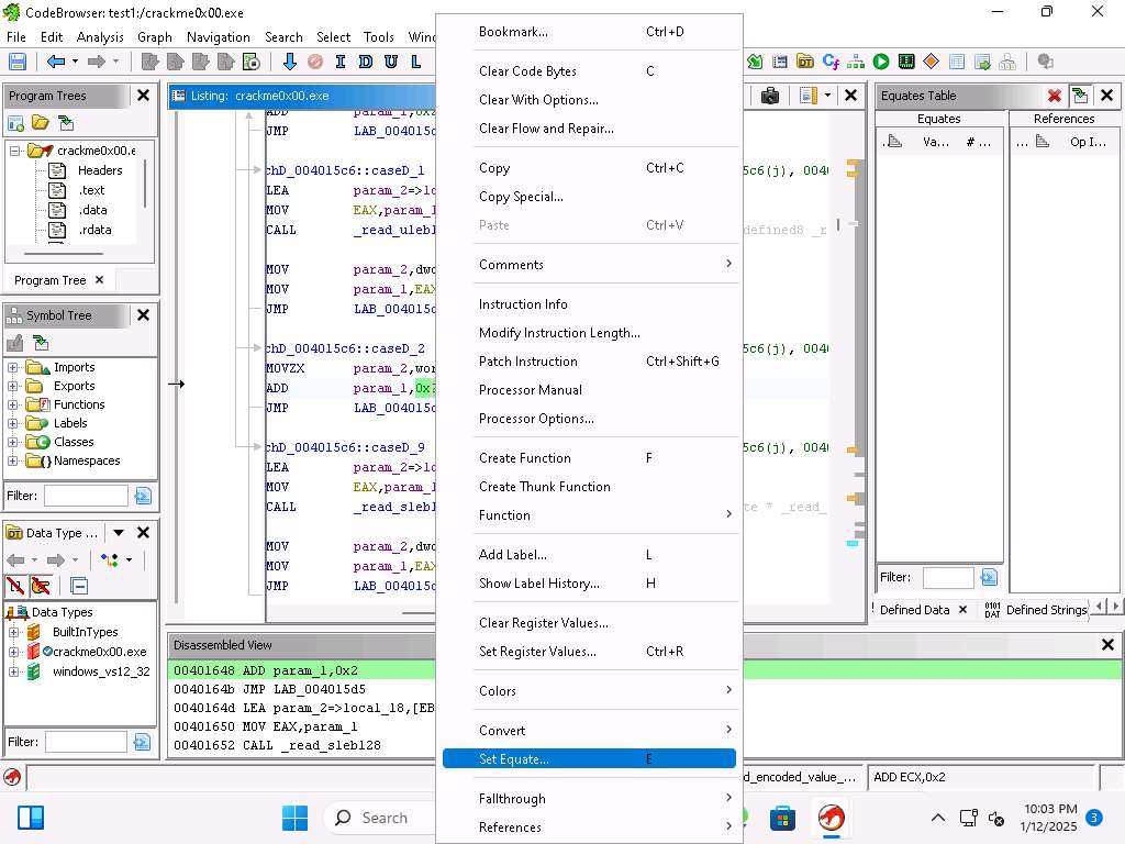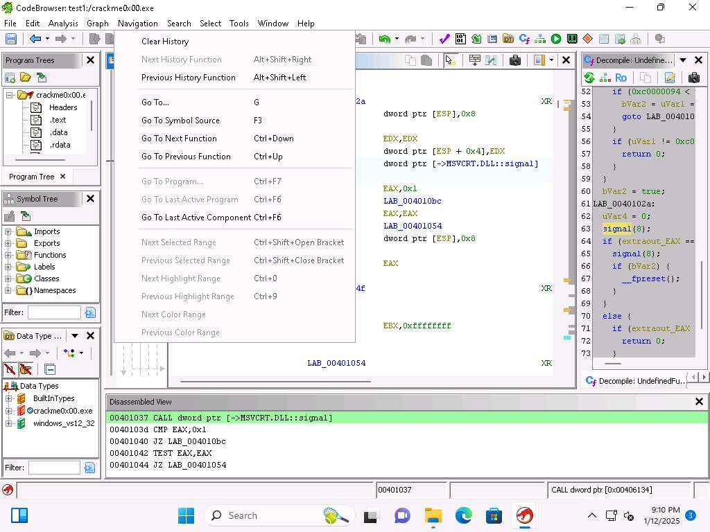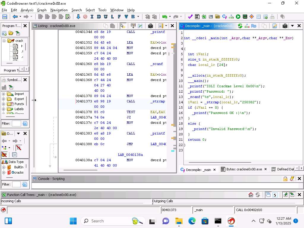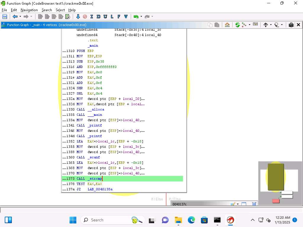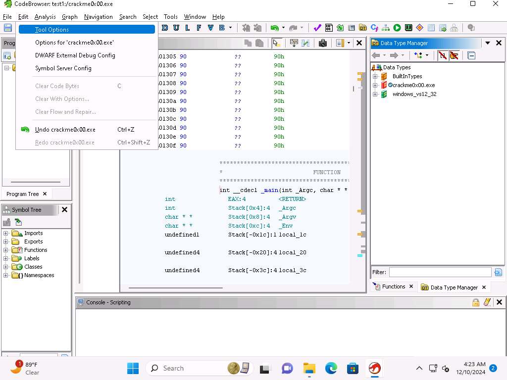 Screenshot This confirms our analysis. Lets decompile now and look at this in Ghidra, click on Window --> Decompiler.
