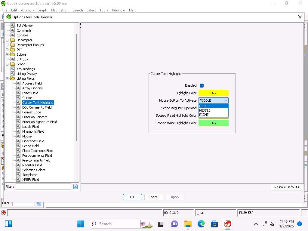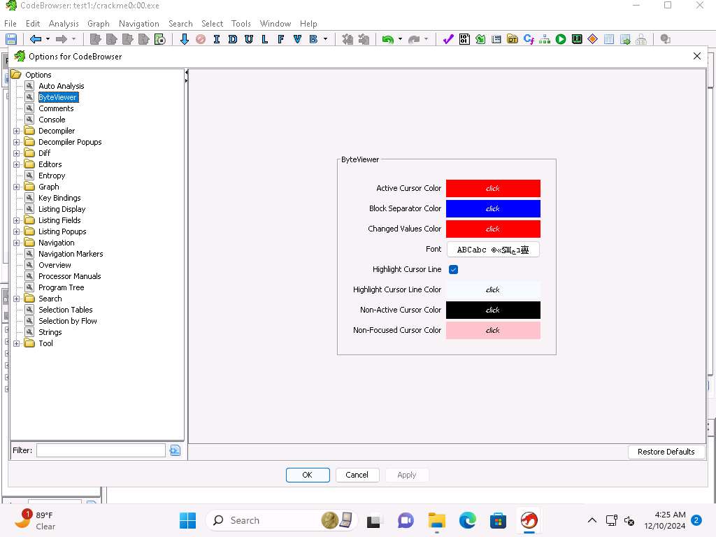Screenshot Take a few minutes and explore the different tool option, as an example, you can click ByteViewer and review the different colors for the interface. Close the Options for CodeBrowser window.