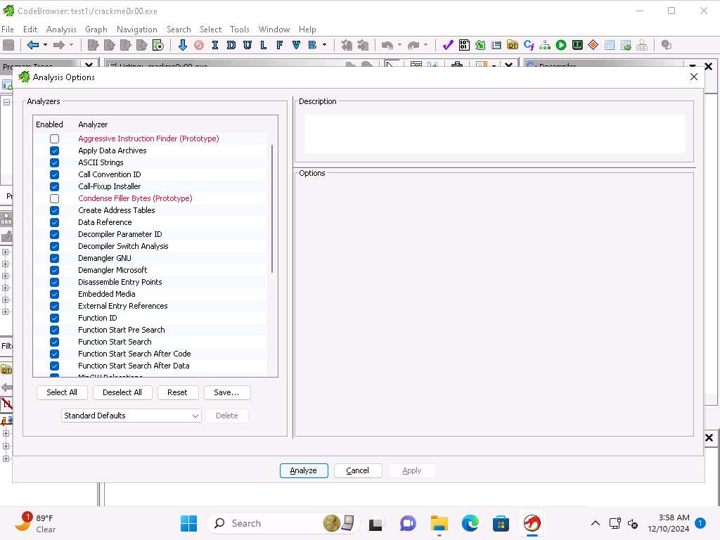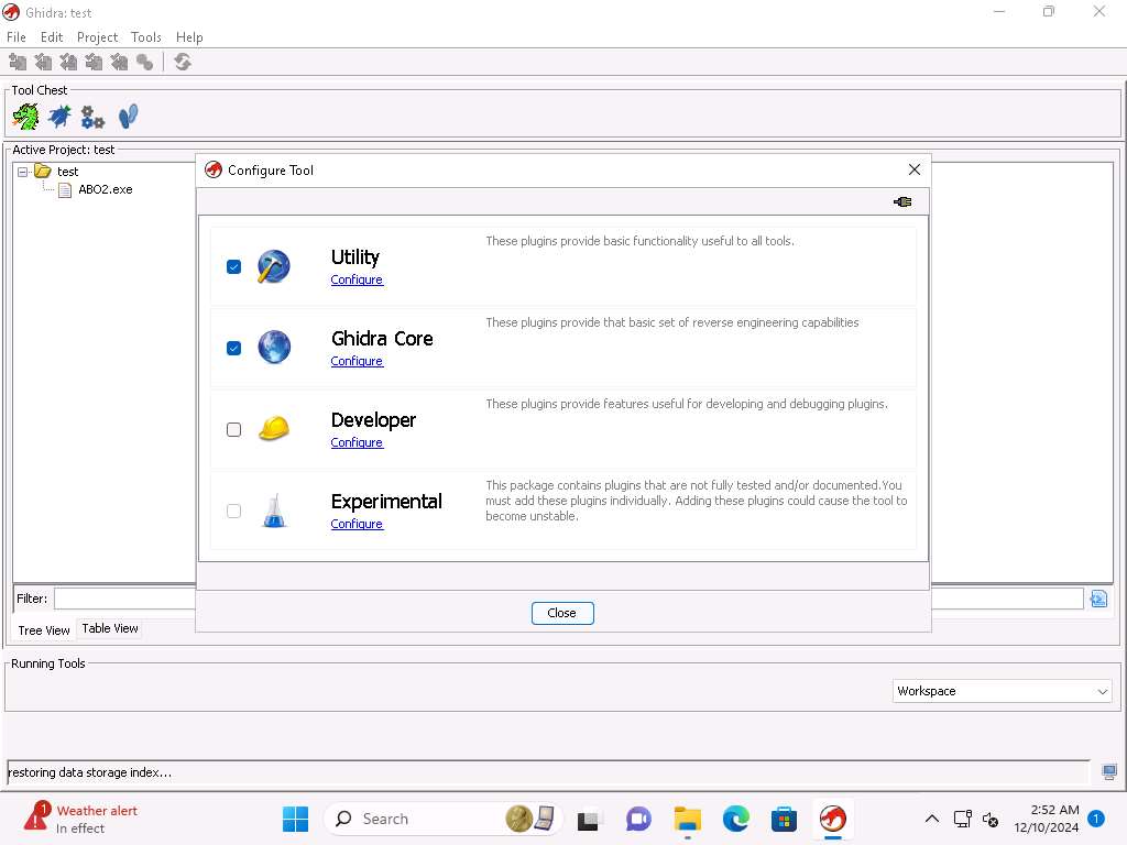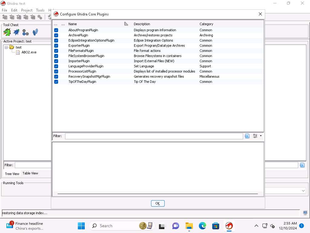 Screenshot Take few minutes and review the plugins and the categories then click OK in the Configure Ghidra Core Plugins window. Click Close in the Configure Tool window.