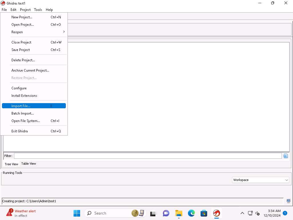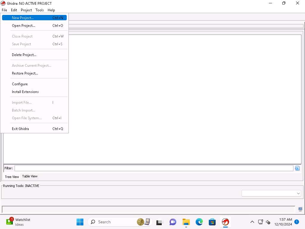 Screenshot Ghidra window appears, click on File-> New Project.