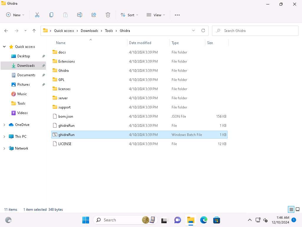 Click on Windows 11 to switch to Windows 11 machine, and navigate to C:\Users\Admin\Downloads\Tools\Ghidra and double-click the Ghidarun.bat file.