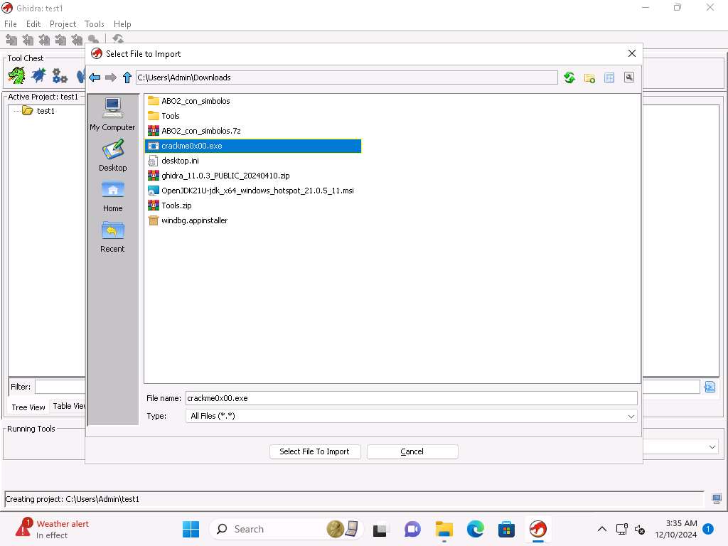 Screenshot Click on File --> Import File and select to the Crackme0x00.exe located at C:\Users\Admin\Downloads location and click on Select File to Import.