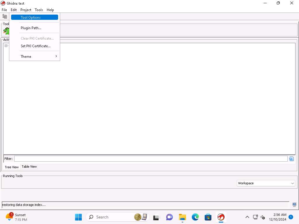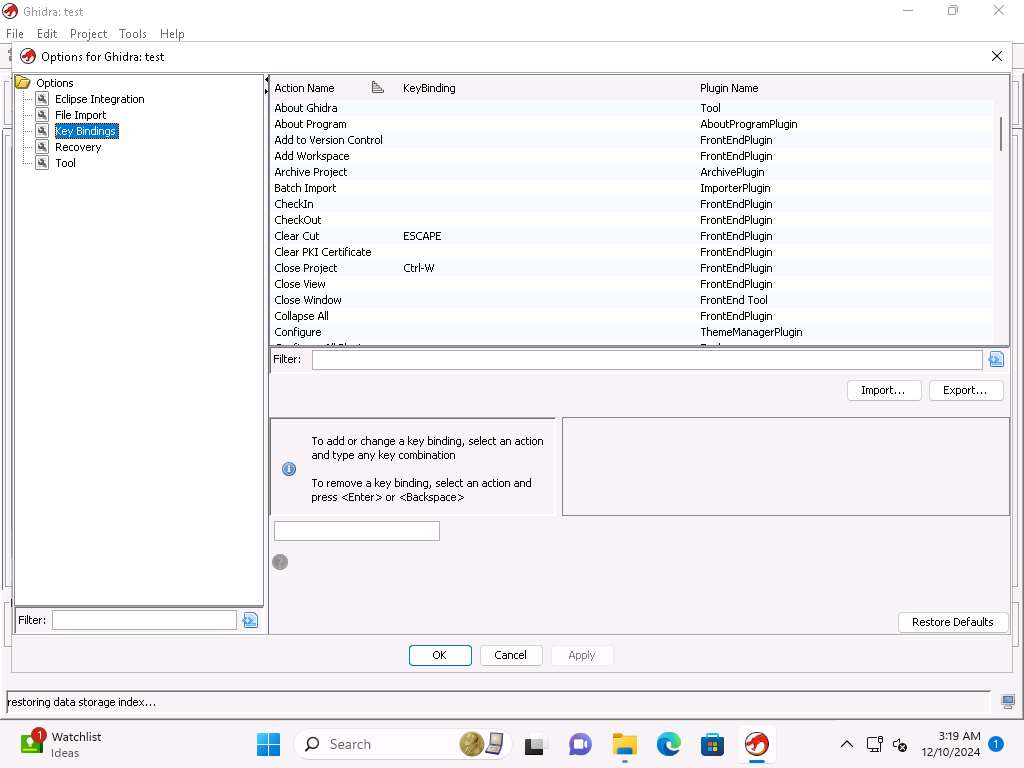 Now click on Edit --> Tool Options, in the Options for Ghidra window click on Key Bindings under Options and close the window after reviewing the key bindings.