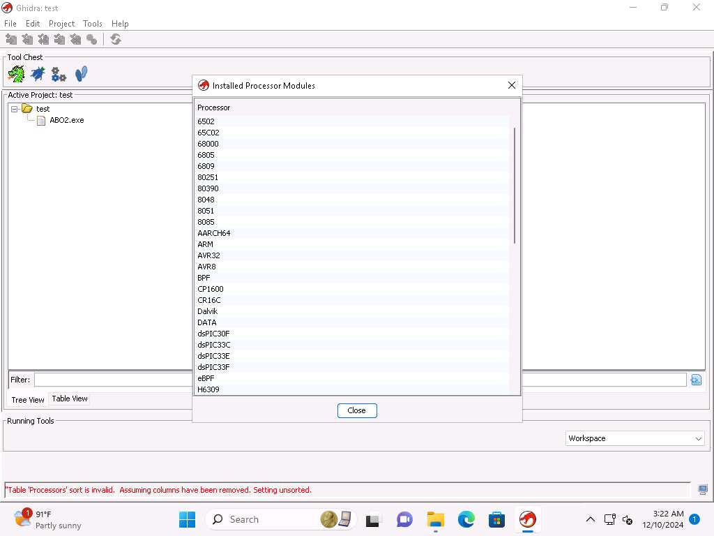 Screenshot Installed Processor modules window apears, we have a lot of different Processors that the tool supports. Take a few minutes and review the different types. Notice the ARM and other types. Close the window.