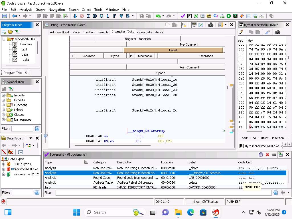 Screenshot As we see from the above image we have the 5 bookmarks that we can reference in the code we have been reviewing. Within these we have the Category, Description, Location, Label and Code Unit. By selecting the Bookmark it will move you to that point in the code.