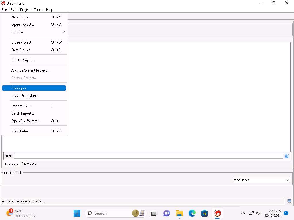 In the Ghidra window, click File --> Configure from the main menu.