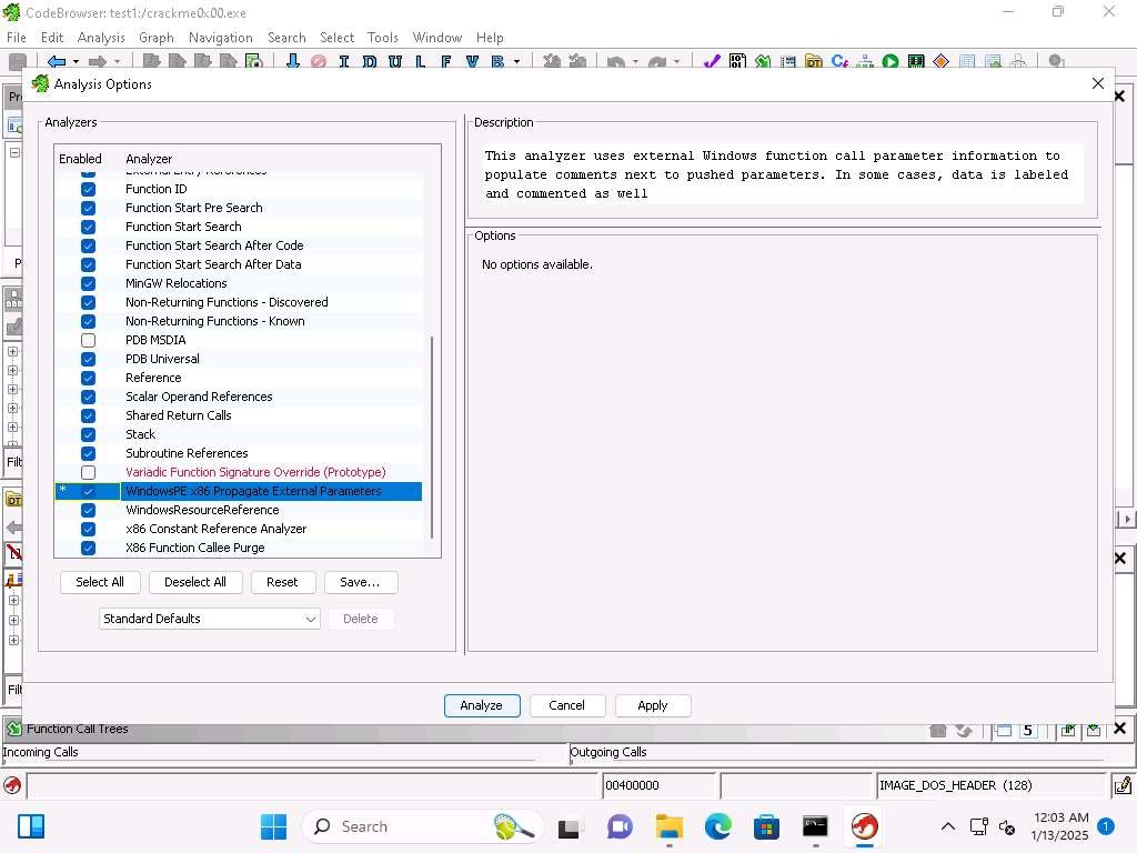 When the tool opens, you will see that the file has not been analyzed, click Yes and in Analysis Options check WindowsPE x86 Propogate External Parameters checkbox, this can assist our analysis by including comments next to the instructions and click on Analyze.