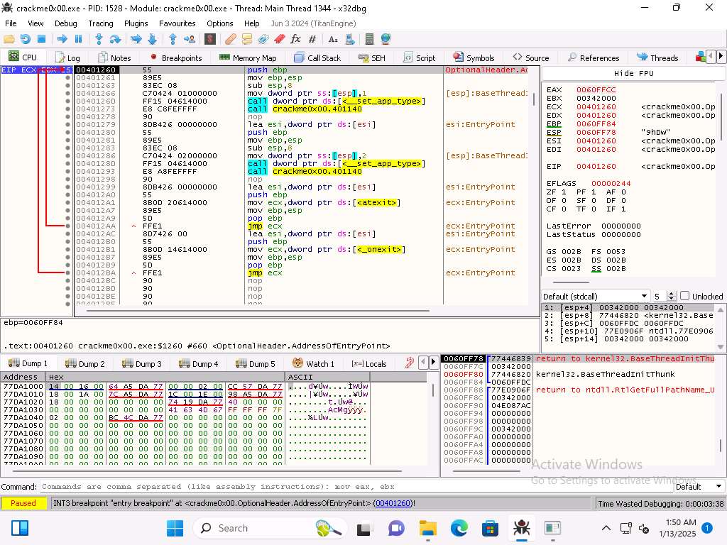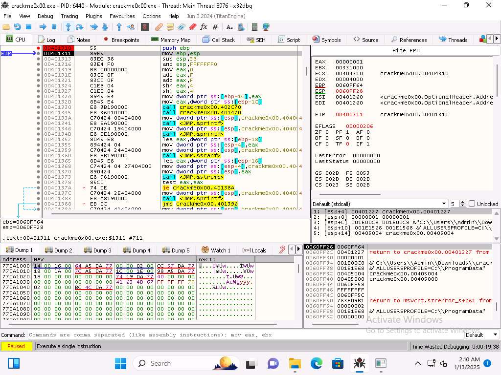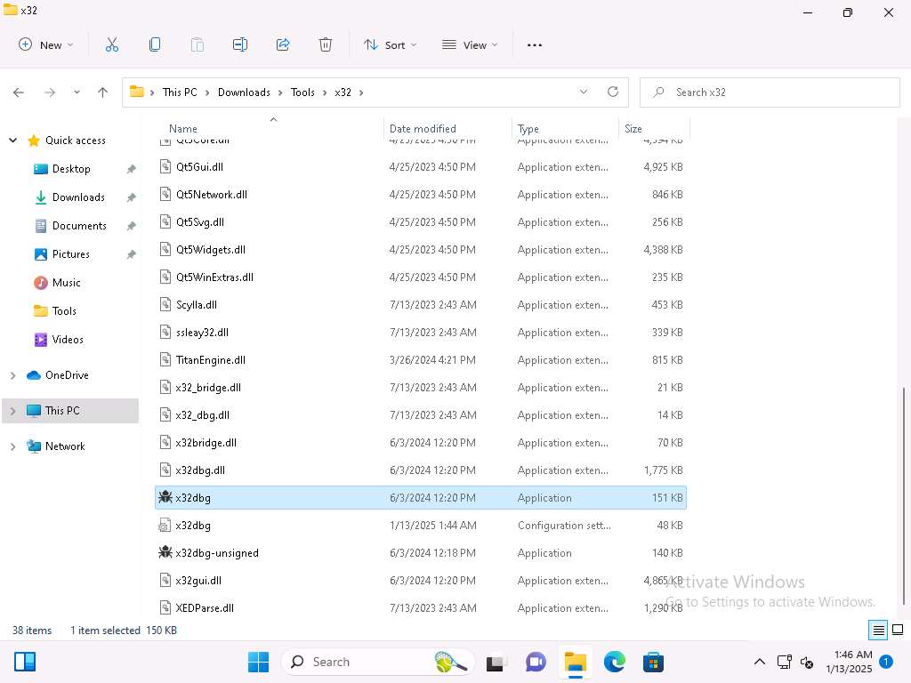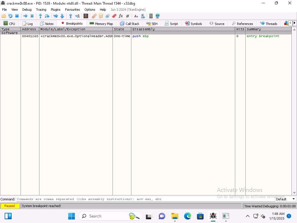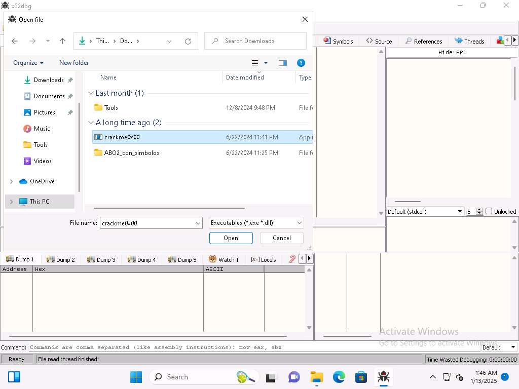 On Windows 11 machine, navigate in the Tools folder to the x32 folder and double-click x32dbg.exe to run the application and then then open the crackme0x00 file in the debugger.