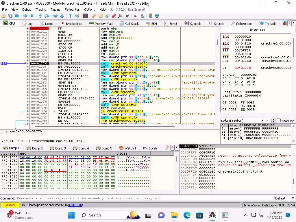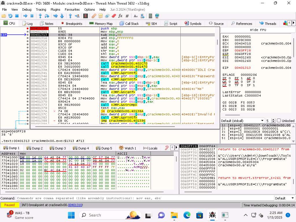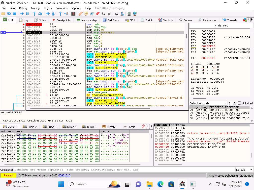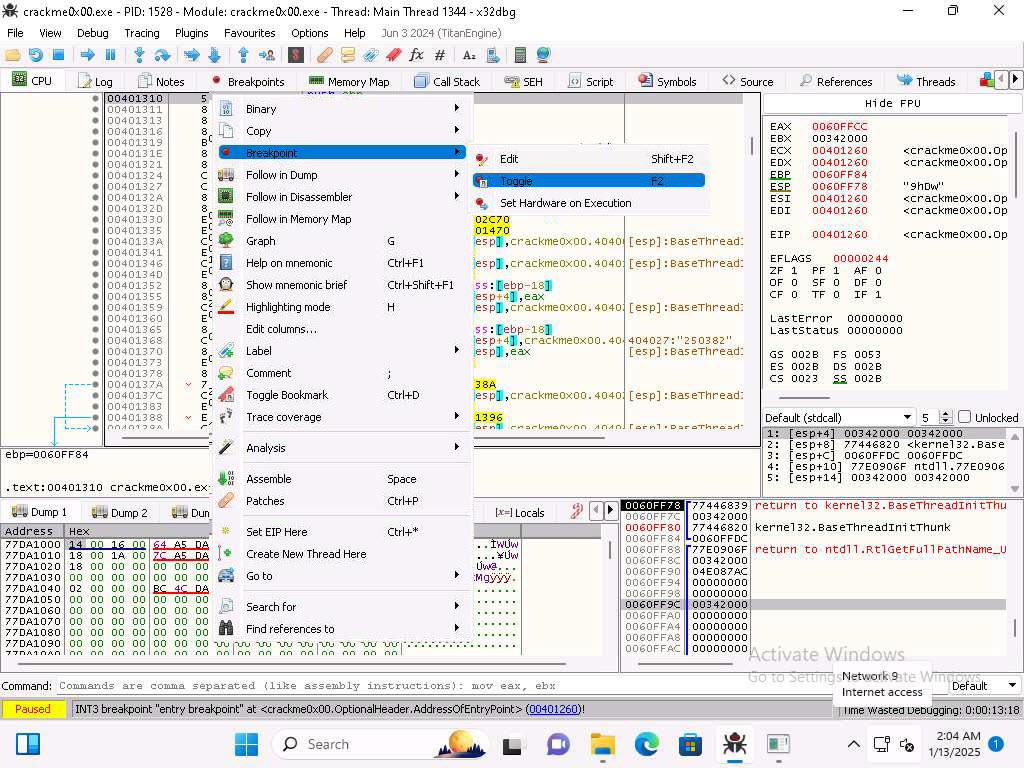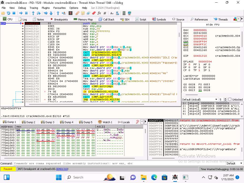 On Windows 11 machine, navigate in the Tools folder to the x32 folder and double-click x32dbg.exe to run the application and then then open the crackme0x00 file in the debugger.