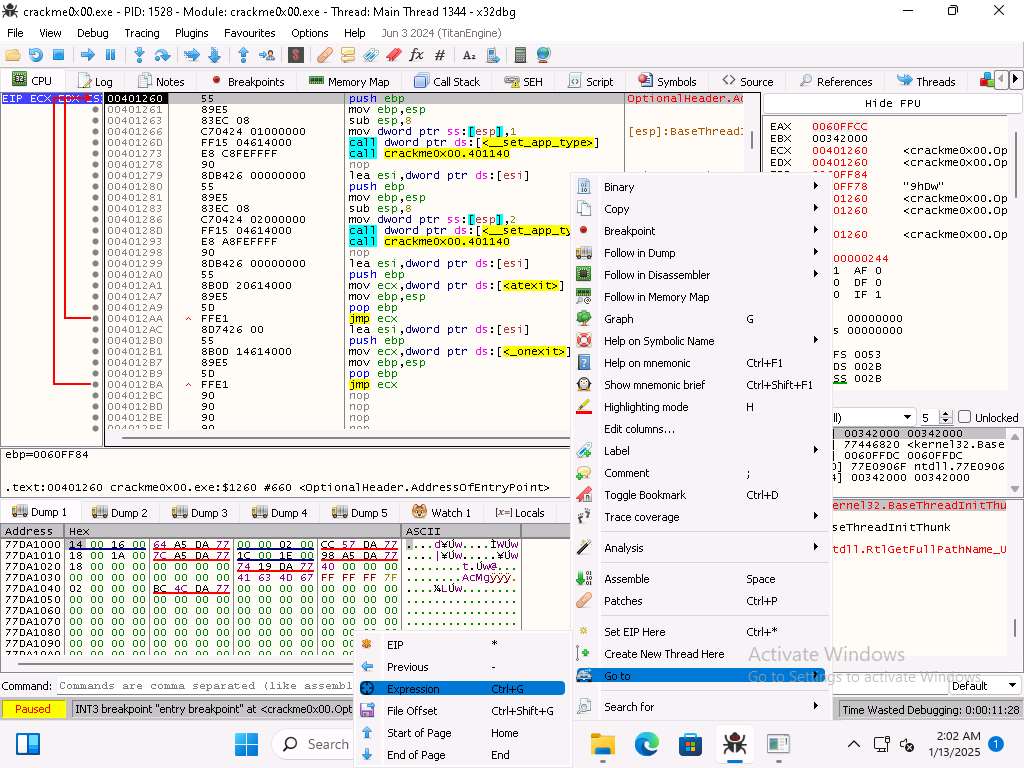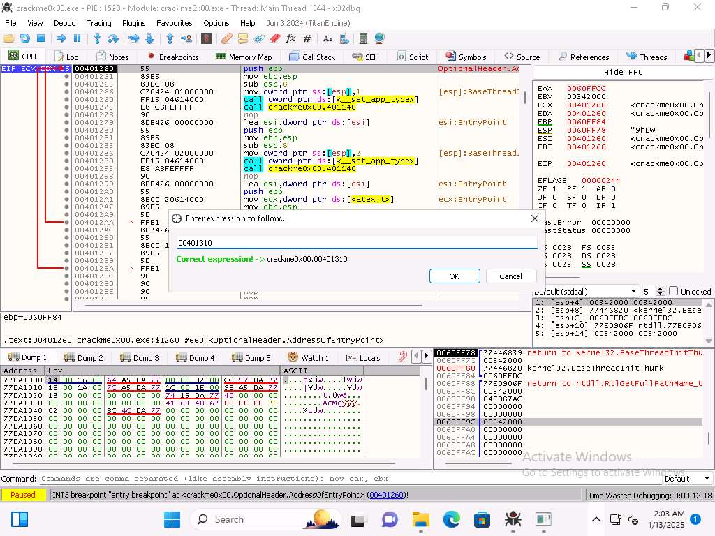 As the image shows, we want to enter address of 00401310 into the right click in the code Go To --> Expression window.