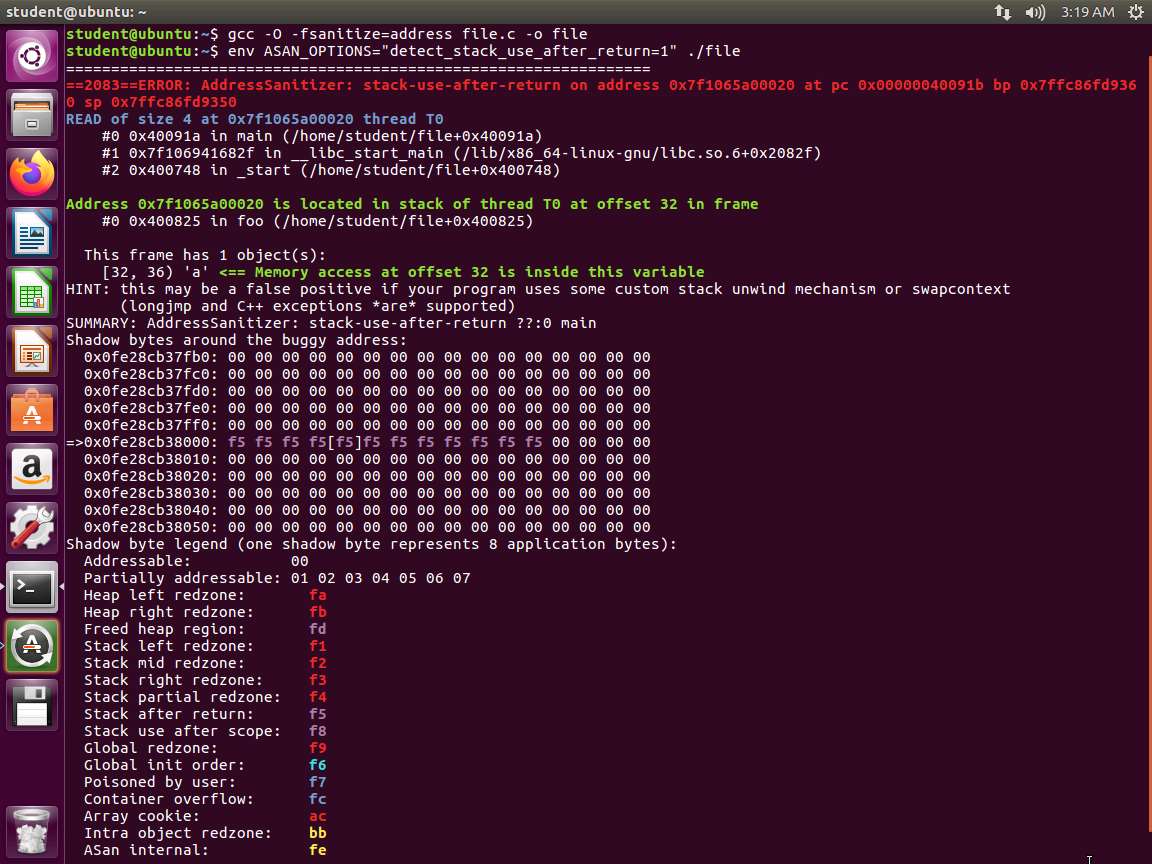 Screenshot Next, we can add detect_stack_use_after_return=1 to the ASAN_OPTIONS environment variable before running the program by entering env ASAN_OPTIONS="detect_stack_use_after_return=1" ./file.